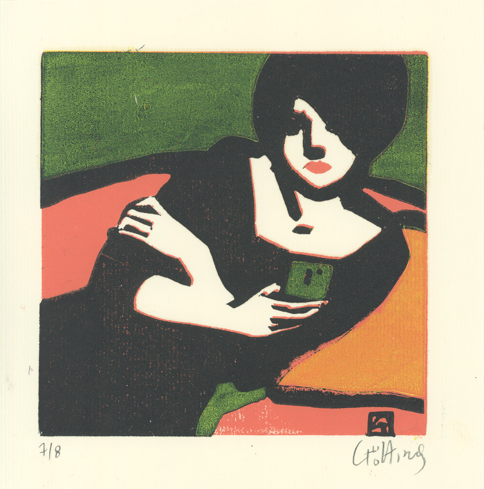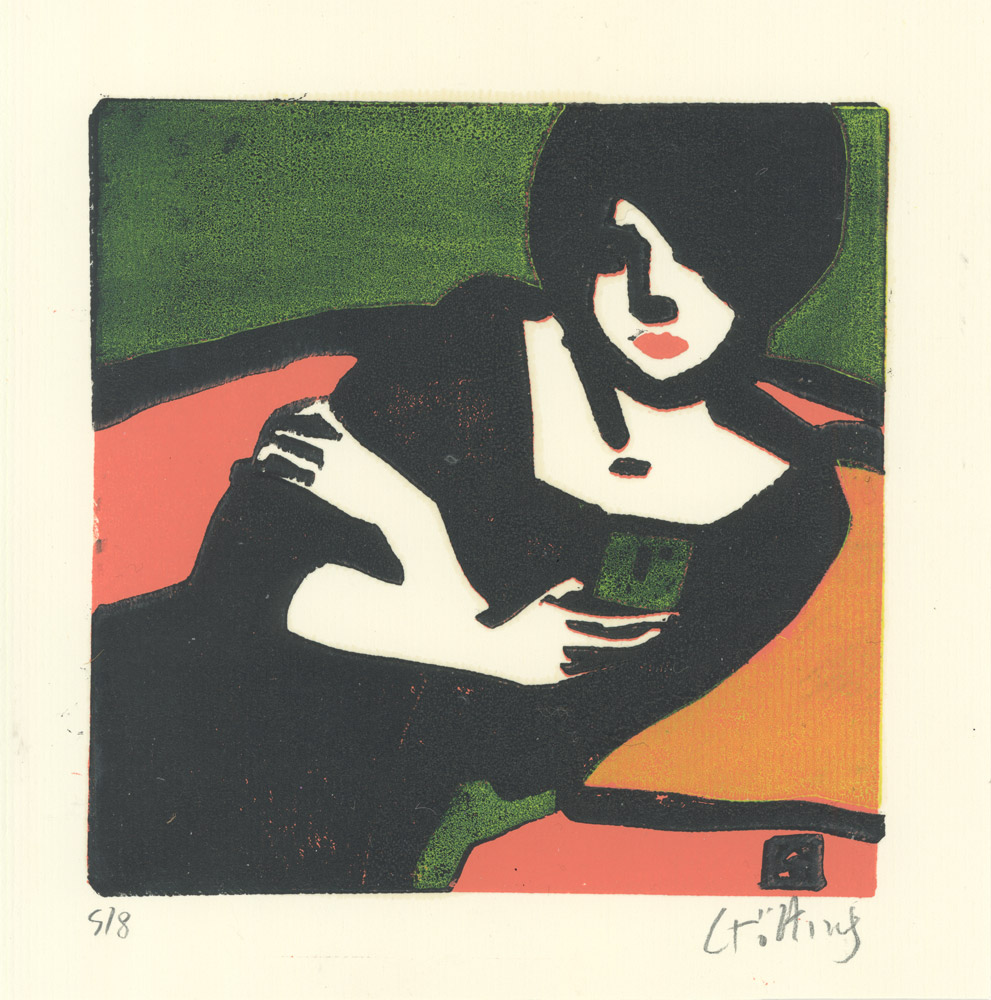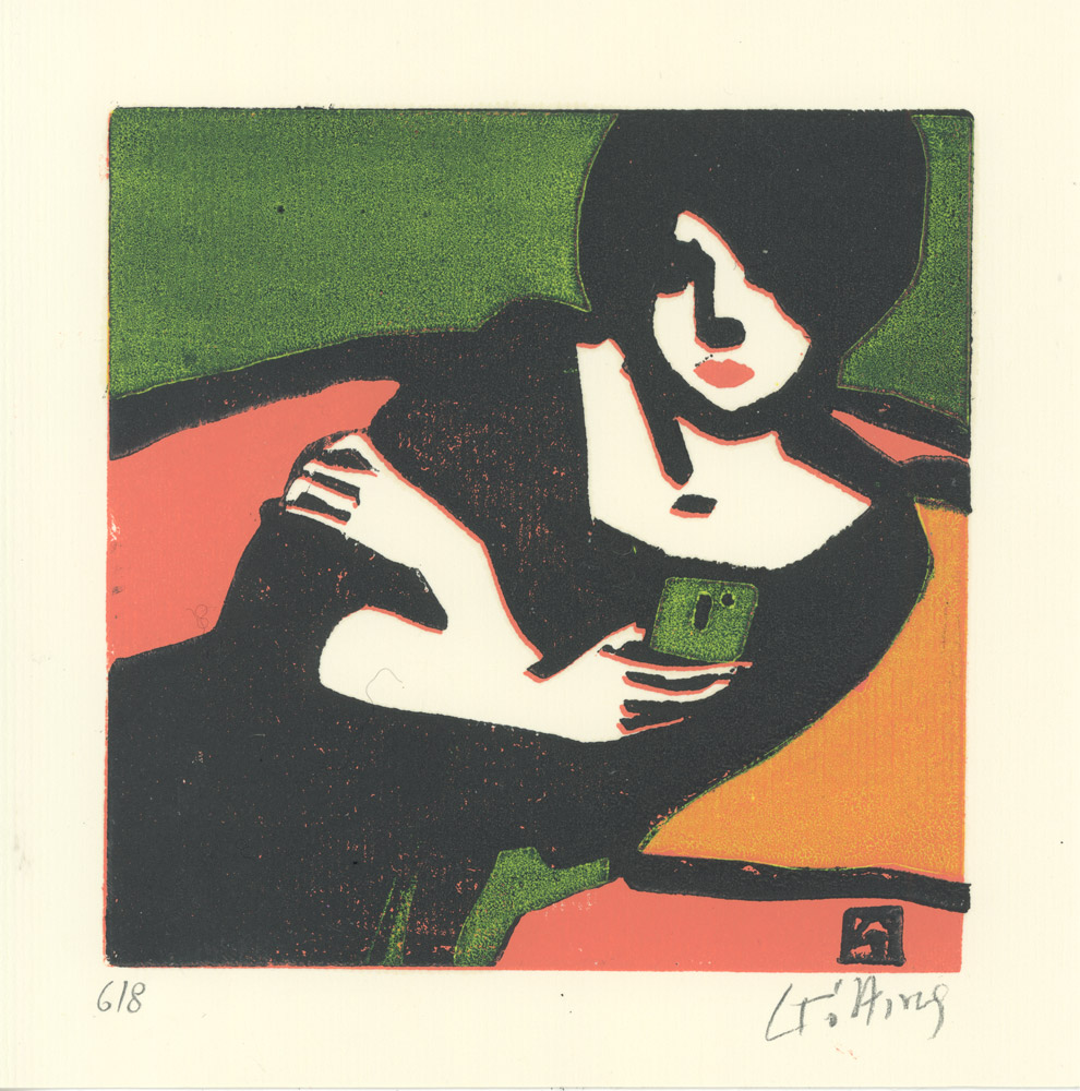 Linogravure 3 couleurs à plaque perdue (les 3 passages sont gravés sur la même plaque successivement. Il n’est donc pas possible de renouveler le tirage, car les 2 premiers états sont perdus.)